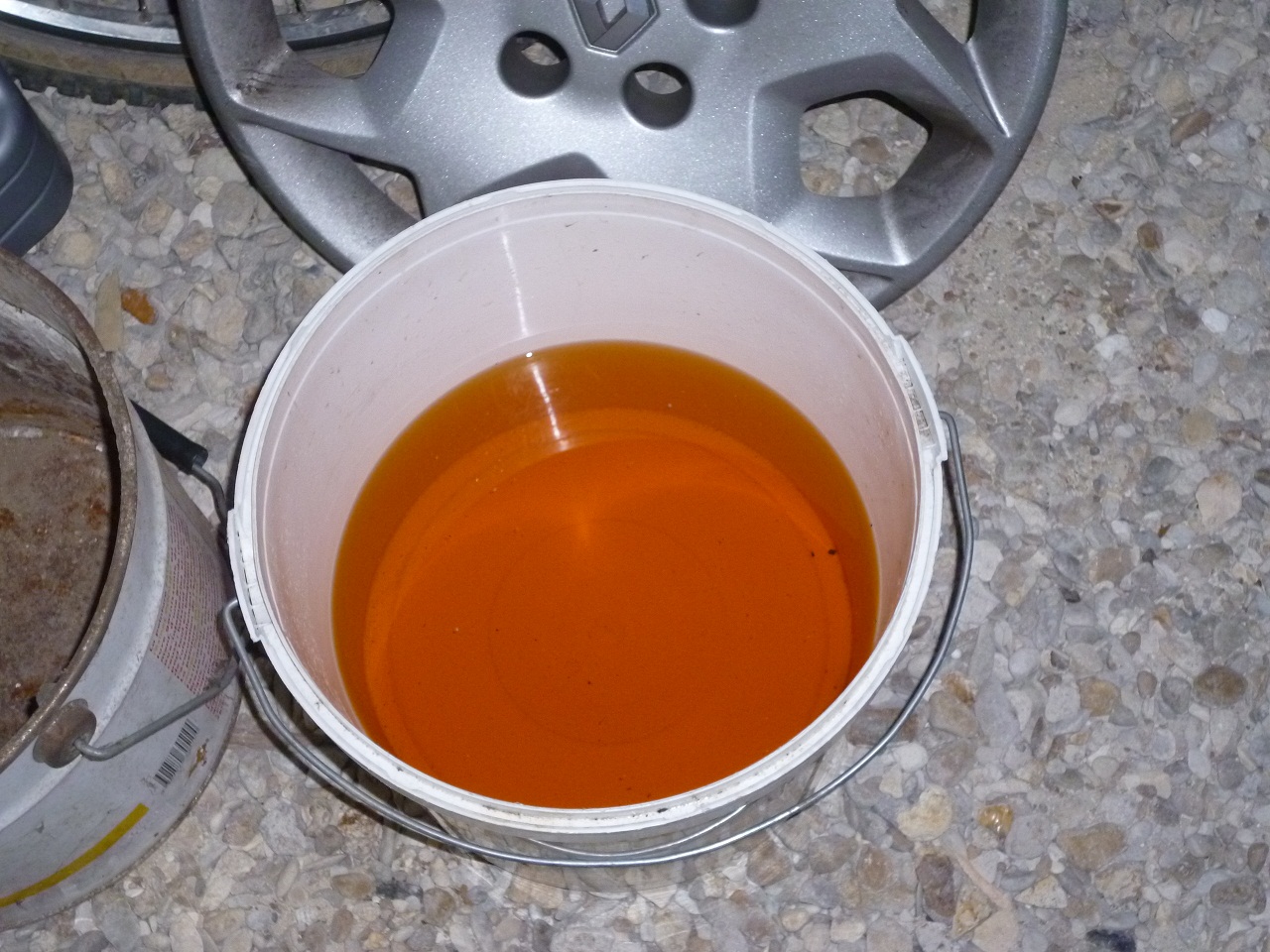 Récupérer environ 5 litres d’ancien liquide marron jaunâtre.